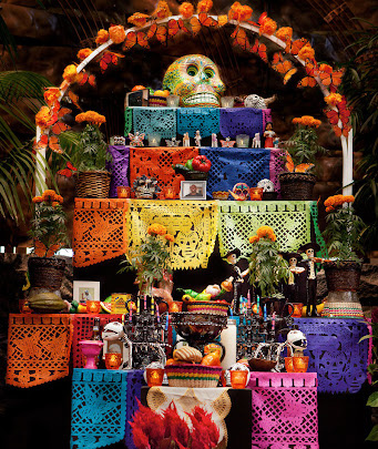 Día de los Muertos wouldn't be nearly as evocative if it weren’t for the proliferated adornment that blossoming flowers like Cempasúchils provide to altars and to private and public spaces such as stores, governmental buildings and parks. They give off a distinctive sweet aroma that embraces everyone. The petals of this flower are laid out as walkways for the dead to find their way on earth so they may be reunited with their loved ones.