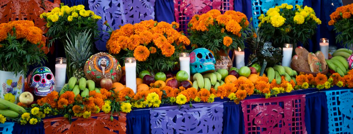 The most important aspect of Día de los Muertos; they guide the souls of lost loved ones and welcome them to the celebration. Most altars include photos, candles, food, flowers, or personal items that belonged to departed loved ones.